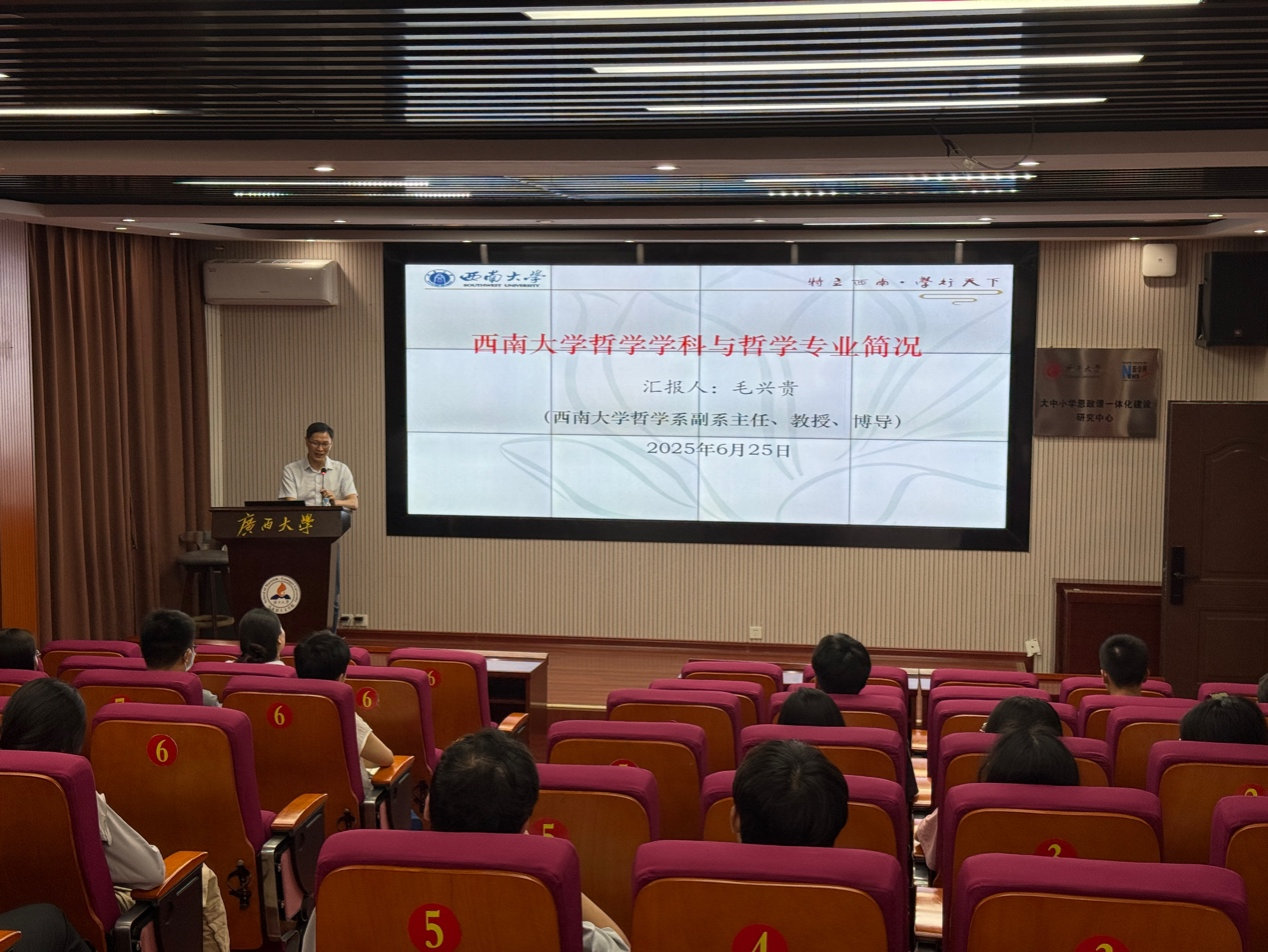 2025年6月25日,西南大学国家治理学院哲学系副主任毛兴贵教授来新葡的京官网开展哲学学科建设交流座谈会和研究生招生宣讲会。