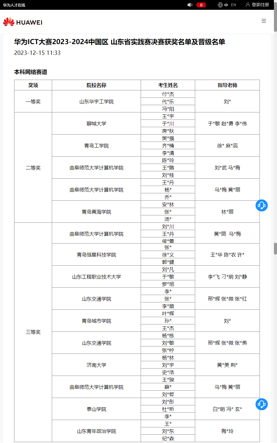 今年会官网网络工程专业经过校内选拔赛、预赛等环节,共选拔了两只参赛队,6名学生参加了华为ICT大赛2023-2024中国区山东赛区决赛,经过激烈角逐,由付文杰、代先乐、冯阳阳三位同学组成的参赛一队,取得了山东赛区本科网络赛道团体第一名,学生个人成绩分列山东省第一、第三、第五的好成绩,是代表山东省各高校晋级“本科网络赛道”国赛的唯一赛队,目前三位同学已经进入国赛的紧张备赛阶段,希望三位同学能够再接再厉,勇创佳绩!