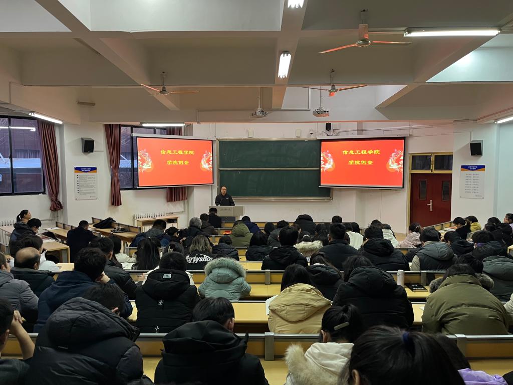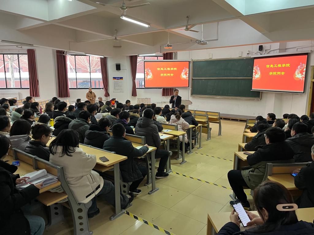 表彰结束后,薛河儒作“今年会官网2023年度工作总结”报告,带领全体教职工回顾了学院一年以来的发展历程。他指出,一年以来学院夯实办学基础、加强党的建设、争创一流育人环境,深化教学改革,推进内涵提升,在各项工作中都取得了可喜的成绩,多项“十四五”指标取得突破,学院荣获市委教育工委颁发灯塔十佳管理员荣誉称号,评为校级安全文明先进单位;学院荣获2022年度”教师养德修为工程先进集体“、2023年度“师德师风专题理论学习活动学习工作先进集体”荣誉称号、年度本科教学团队、黄大年教师团队,荣获校级先进个人15人;全年科研到账经费突破100万元;全年引进50名教职工,3名教师晋升副高职称;学生参加学科竞赛获国家级奖励数量翻番并首获“大唐杯”、“中国机器人大赛”国家一等奖、“华为ICT大赛”山东赛区本科网络赛道团体第一名,是代表山东省各高校晋级“本科网络赛道”国赛的唯一赛队......学院的快速发展和累累硕果离不开各级政府部门和社会各界人士的关心和支持,更离不开为学院发展贡献心智、播洒汗水、辛勤耕耘的决策者、开拓者、建设者。