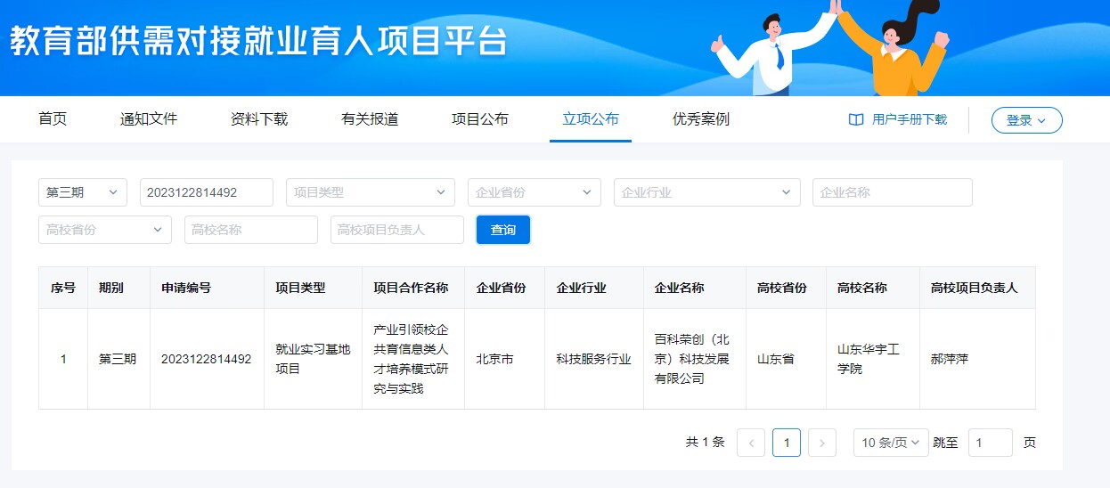 6月14日,教育部供需对接就业育人项目平台发布了《关于公布教育部第三期供需对接就业育人项目立项名单的通知》(教就业司函〔2024〕23号),我院郝萍萍老师的产业引领校企共育信息类人才培养模式研究与实践项目顺利立项。