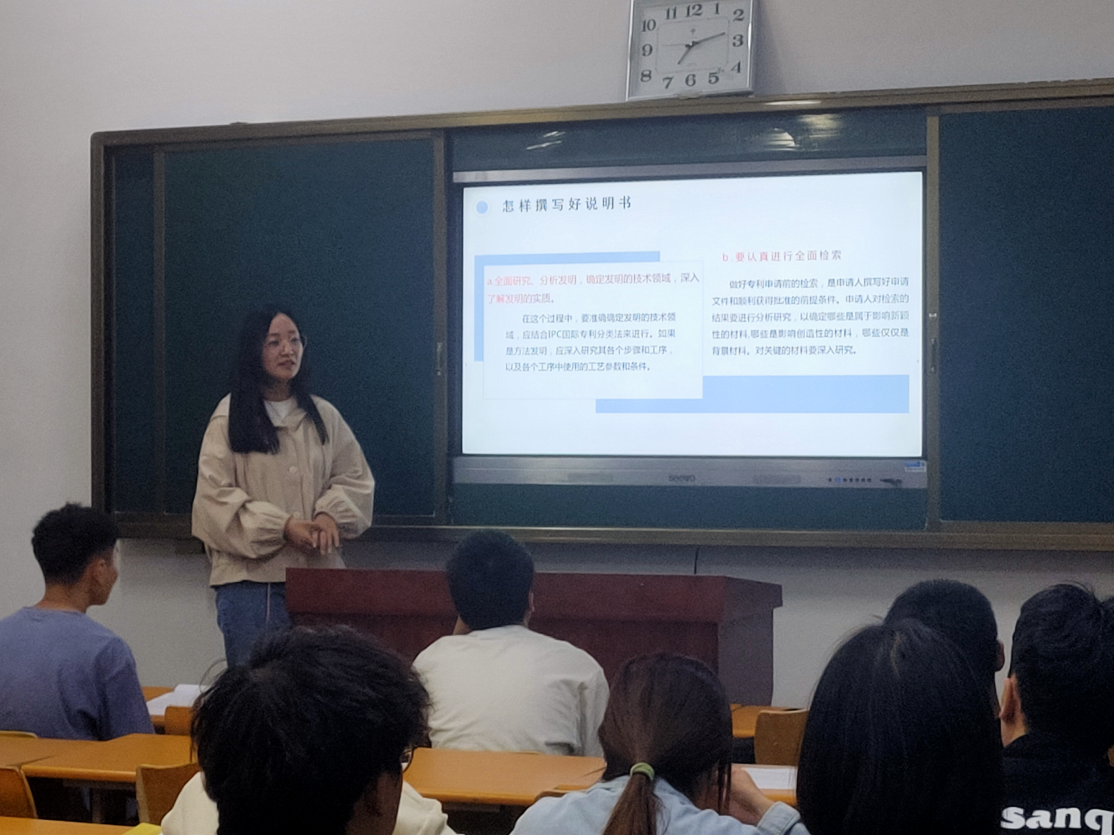 为进一步推动科技创新,促进知识产权保护,今年会官网学生会副主席孙瑞环在4月29日晚自习于22教学楼507教室为20级软件技术的各位同学进行专利说明撰写讲解活动。